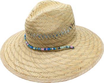 Top off your sunny-day look with this effortlessly chic straw hat wrapped with a beaded strap.