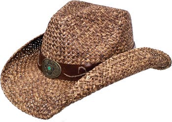 A dark brown woven cowboy hat with a band and embellishments is sure to be your next go-to for summertime wear.