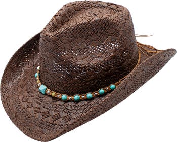 The perfect accessory for warm-weather adventures, this cowboy hat crafted from straw is covered with a colorful beaded band.