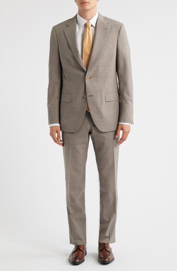 Dusky-tan wool patterned in a chalky, subtly slubbed microcheck distinguishes a suit that's cut in a regular fit with a lightly contoured jacket providing a streamlined profile. The flat-front trousers sit comfortably at the waist and complement the traditional detailing to keep the silhouette crisp and clean.