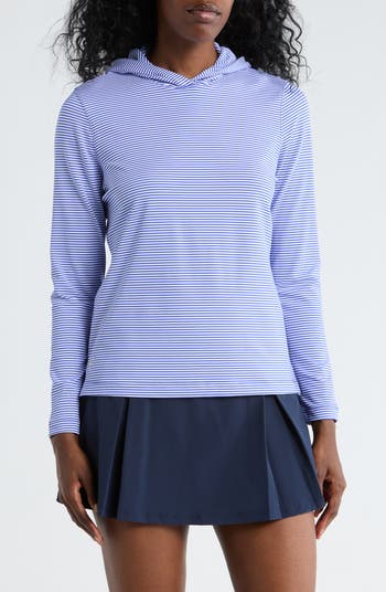 The color, boxy fit, and sporty hoody style make this a new favorite in my activewear wardrobe. It’s cute for golf as well as running errands, casual coffee with a friend. The hood is not flimsy, and I like that there are no drawstrings for a clean look. It goes well with the Diamond quilt vest. The color and the stripes make it more special.