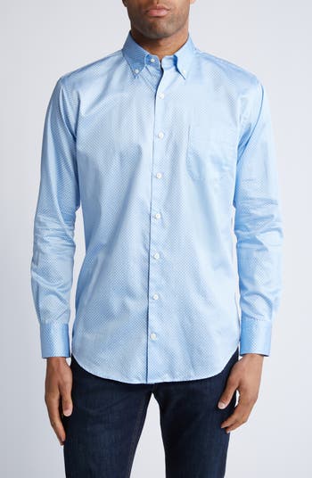 Crisp, breathable cotton patterned in tiny geometries brings polish and comfort to a shirt styled with buttons in the collar for a classic look.
