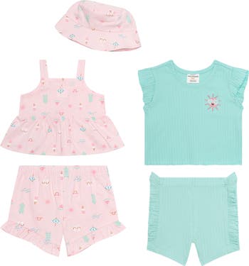 Sweet ruffles and playful prints define this charming assortment of sets for baby that's sweetened further by a matching bucket hat for sun protection.