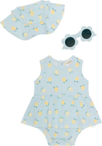Baby will be ready to rock all summer long in this lemon-print bodysuit and hat set complete with matching sunglasses.