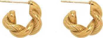 A double twist design creates dimenion in the shine of these golden hoop earrings.