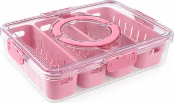 Easily access various food items in this organized storage basket featuring four sections and a clear lid.