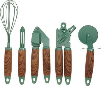 Perfect for the at‑home chef, this set features a peeler, pizza cutter, garlic crusher, can opener and whisk, all finished with faux‑wood handles.
