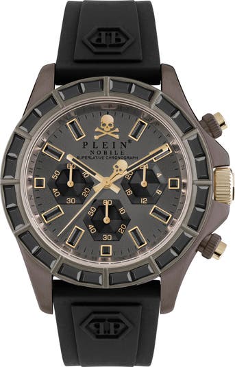 Chronograph movement enhances the functionality of this stainless steel watch secured by a sporty silicone strap and glinting with crystal indexes.