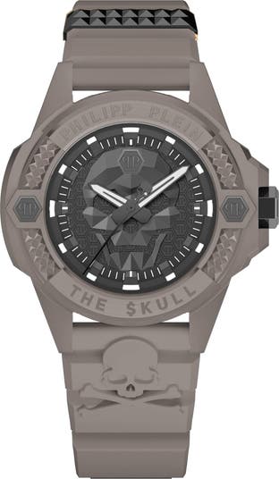 A geometric skull grins from the guilloche dial of a stainless steel watch featuring a ceramic-plated case and secured with a silicone strap for sporty style.