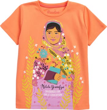 This brightly colored cotton tee is fronted by an illustration by artist Sarah Watts of Malala Yousafzai, the Pakistani human rights activist and advocate.