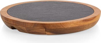 With a nod to sleek Danish design, the Insignia Acacia and Slate Serving Board with Cheese Tools marries centerpiece-worthy shape and color with ingenious function. The removable slate serving tray rests atop a durable acacia 9.5 inch wood cheese cutting board base. A hidden notch on the side of this cheese board set opens a drawer that holds three cheese tools in gold titanium-coated stainless steel with wood handles. This multipurpose board pulls quadruple duty as a cutting board, serving board, cheese set, and design-forward dynamo. Level up your next dinner party with this complete charcuterie and serving set.