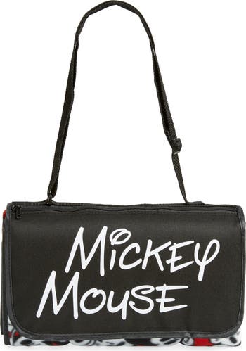 A delightful Mickey Mouse print details a cozy picnic blanket that folds neatly into a compact tote for easy carry.