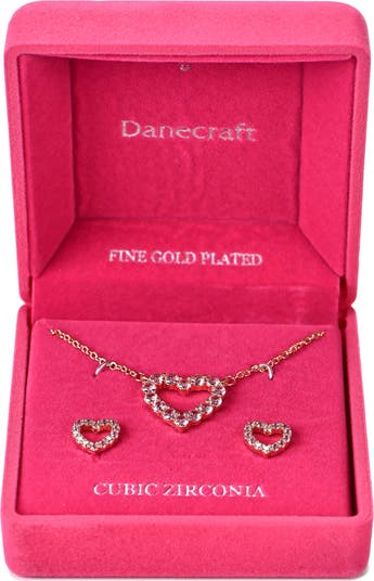 Pink cubic zirconia illuminate this heart pendant necklace and stud earrings set with sparkly romance.