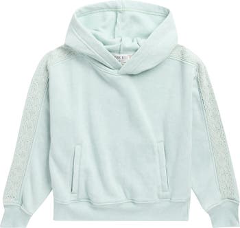 Lace trim sweetens the sleeves of this kid-approved cotton-blend hoodie styled with handy welt pockets.