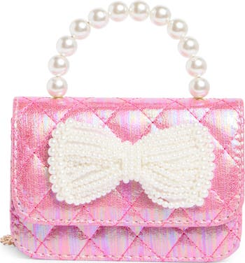 An iridescent finish and lustrous faux pearls embellishing the bow and top handle put a glam spin on this kid-sized handbag textured with luxe diamond quilting.
