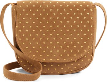 Sweeten your kid's day with this faux-suede crossbody bag fashioned with a snap-flap closure to keep their treasures secure.