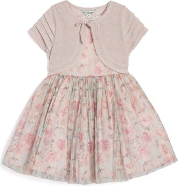 A metallic shrug and flowery tulle dress team up to serve as a picture-perfect ensemble for your little one.