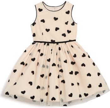 Give your kid sweet special-occasion style with this flocked party dress featuring a fitted bodice with a back heart cutout and a flared mesh skirt.