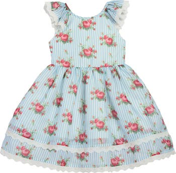 Sweeten your kid's day with this lace-trimmed fit-and-flare dress featuring a charming floral stripe print.