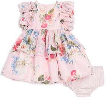 Outfit your little darling in this party dress textured with an enchanting floral print and framed by fluttering sleeves. Matching bloomers complete this adorable look.