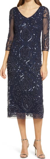 French curves sparkle and swirl across this sheer-sleeve sheath, setting a romantic and glamorous tone for your evening event look.