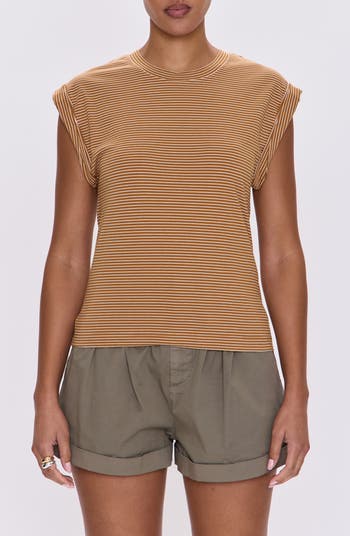 Barely there cuffed sleeves extend the shoulder line of an all-cotton T-shirt wrapped in perky pencil stripes.