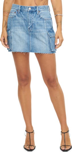 Cargo patch pockets add workwear-chic style to this sassy miniskirt cut from medium-wash denim.