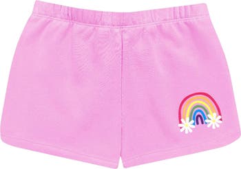 Upgrade their laid-back staples with these cloud-soft shorts styled with a rainbow graphic and dolphin hems.