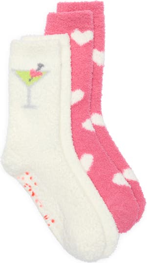Keep your toes cozy with this cute pack of crew socks featuring a fuzzy texture and a mix of heart and martini patterns.