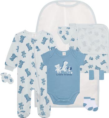 - Set includes: sleeper, bodysuit, bib, mitts, socks, three washcloths, blanket and a garment bag