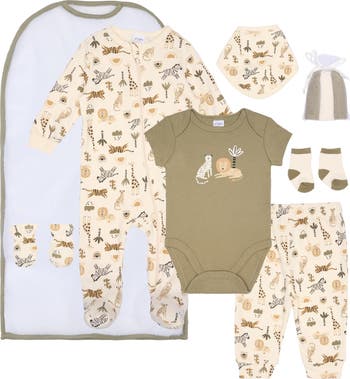 Give your little bundle the perfect welcome with this ten-piece cotton baby set filled with cozy essentials and an adorable print.