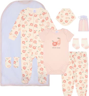 - Set includes: sleeper, bodysuit, bib, mitts, socks, three washcloths, blanket and a garment bag