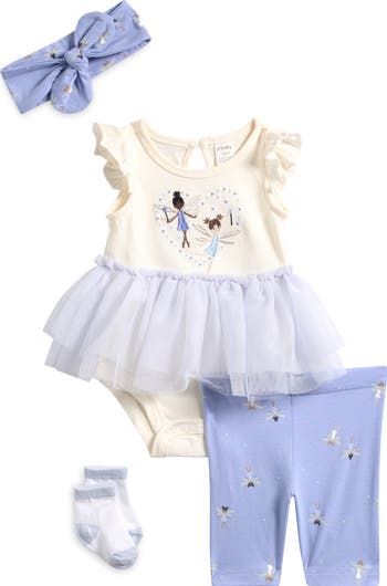 Dancing fairies bring kid-approved whimsy to a tutu bodysuit and leggings set instantly sweetened by a matching headband and socks.
