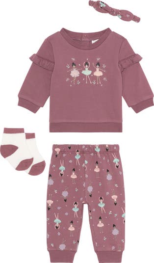 Have baby stay cozily warm during cold-weather days in this set featuring a ruffled appliqué sweatshirt, printed joggers, socks and a bow headband.