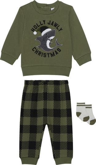 Your little love will look adorable in this three-piece sweatshirt set featuring a dinosaur appliqué with matching joggers and socks.