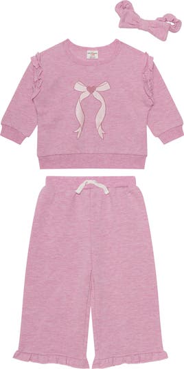 Baby will be looking adorable while staying cozy in this set featuring a ruffled sweatshirt, matching pants and a headband.