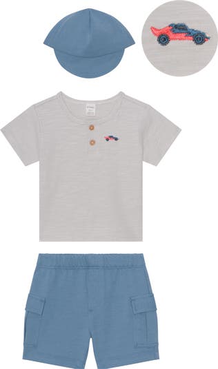Your little speedster will play the day away in the comfort of this embroidered henley, knit cargo shorts and coordinating baseball cap set.