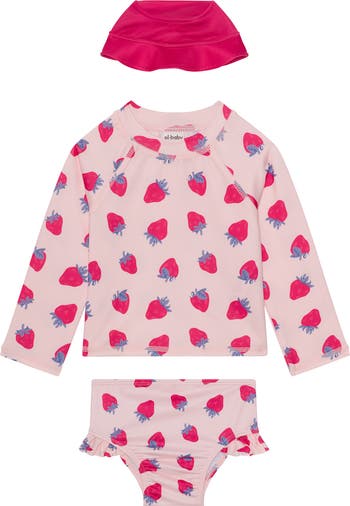 A strawberry long-sleeve two-piece rashguard swimsuit and bucket hat set is made from stretchy fabric that'll protect your baby from the sun's rays.
