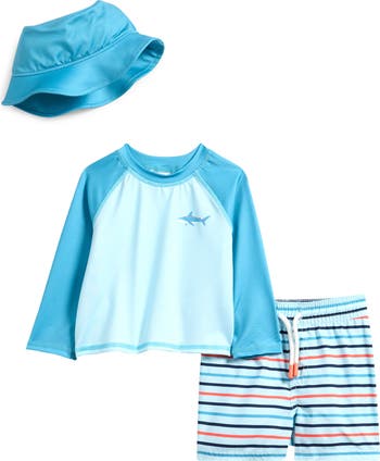 Get baby ready for a day of splashing and playing in this three-piece set featuring a sun hat, long-sleeve rashguard and coordinating swim trunks.