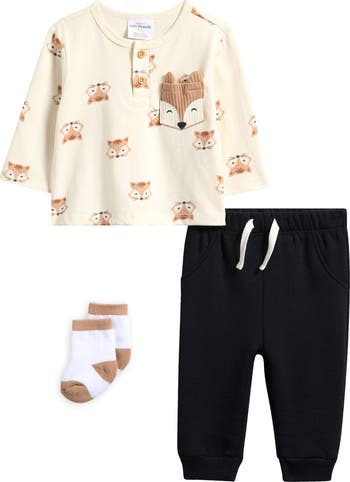 Baby will be looking cute and cozy in this set featuring a fox-adorned top, joggers and socks.