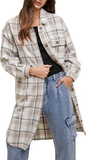 Layer on this cozy plaid shirt-jacket constructed in a longline silhouette complete with handy pockets and a curved, vented hem.