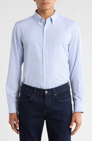 Plaid stretchy performance fabric defines this button-up shirt featuring a button-down collar and a curved hem for effortless style.