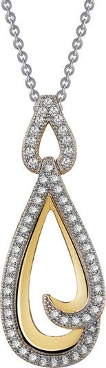 Dazzling simulated diamonds adorns the open swirl design of this pendant necklace with a teardrop silhouette.