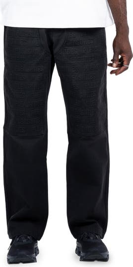The iconic font makes an impact at the front of these workwear-inspired jeans made with nonstretch denim and relaxed straight legs.