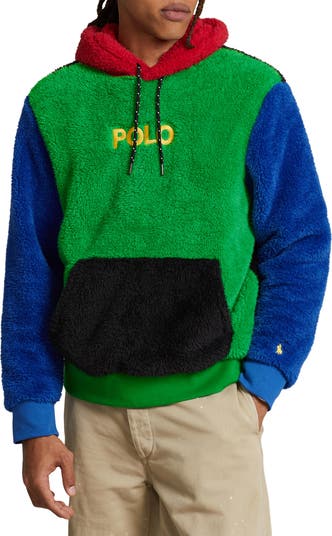 An embroidered script logo centers the chest of this cool colorblocked hoodie made from curly high-pile faux fur.