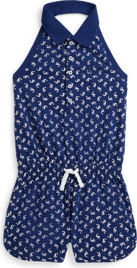 A dolphin print lends playful charm to a mesh stretch-cotton romper cut in a trendy halter silhouette.