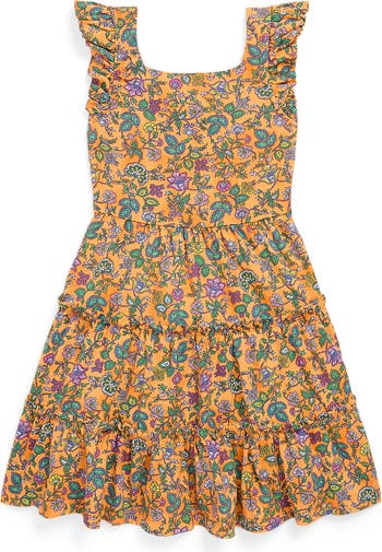 A knotted open back brings extra charm to this tiered floral cotton dress perfect for kiddos who love to twirl.