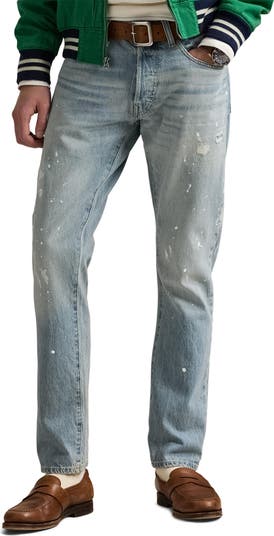 Splatter paint details and slight distressing further the casual-cool styling of these slim-fitted jeans made from stretch-kissed denim in a light wash.