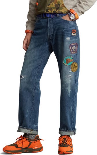 Slight distressing and expedition-inspired patches further the casual-cool styling of these straight-legged jeans cut from nonstretch denim.