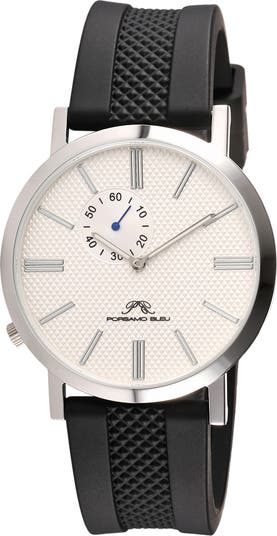 A clean, easy-to-read dial and offset seconds subdial distinguish this Japanese-made quartz watch completed with a textured silicone strap that matches the dial patterning.